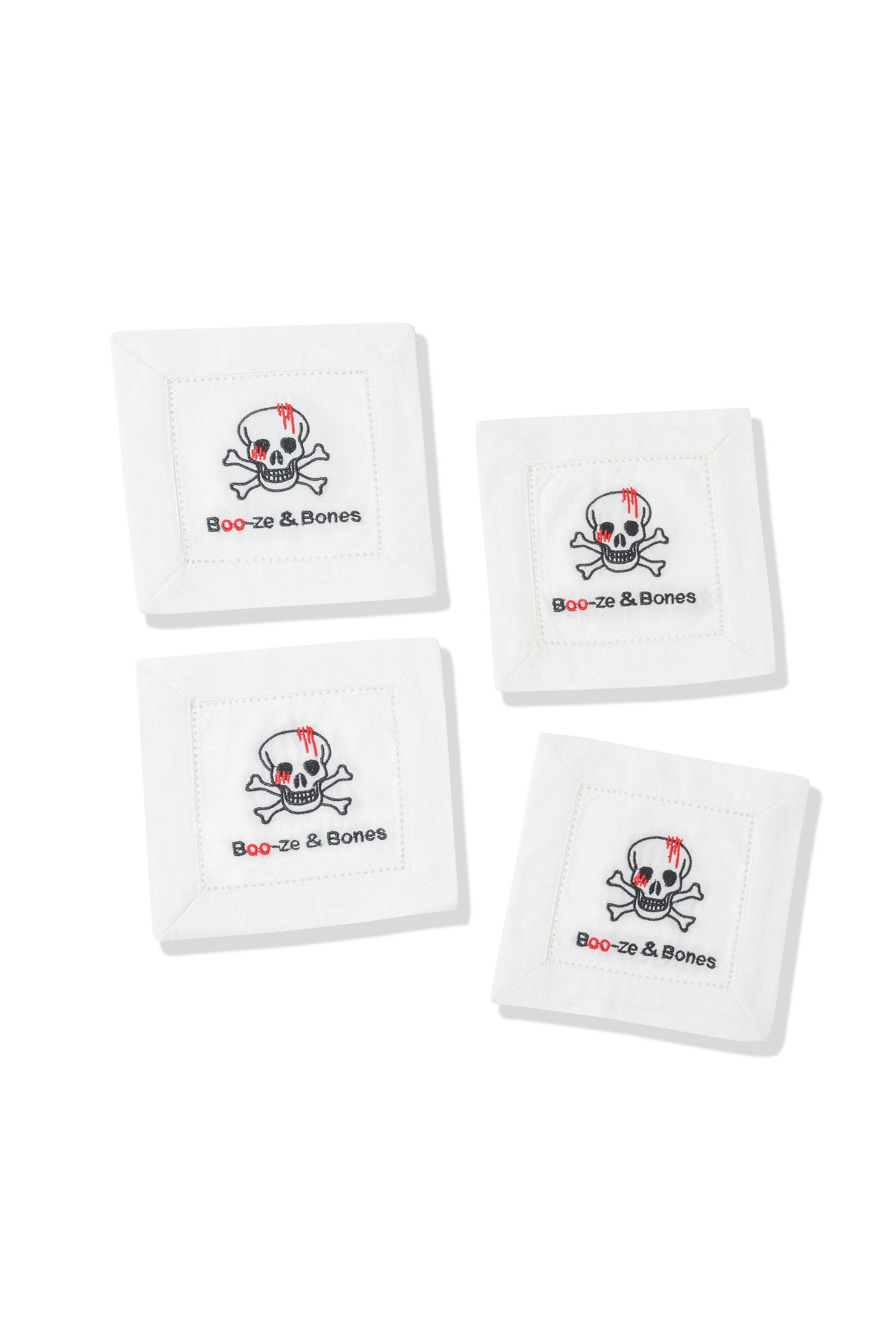 Against a crisp white background, each napkin features a striking, intricately embroidered skull and crossbones motif, cleverly accented with a dash of red and the witty phrase "Boo-ze & Bones." The detailed stitching and quality linen create a sophisticated yet daring accent, perfect for themed parties or adding unique character to your home bar.