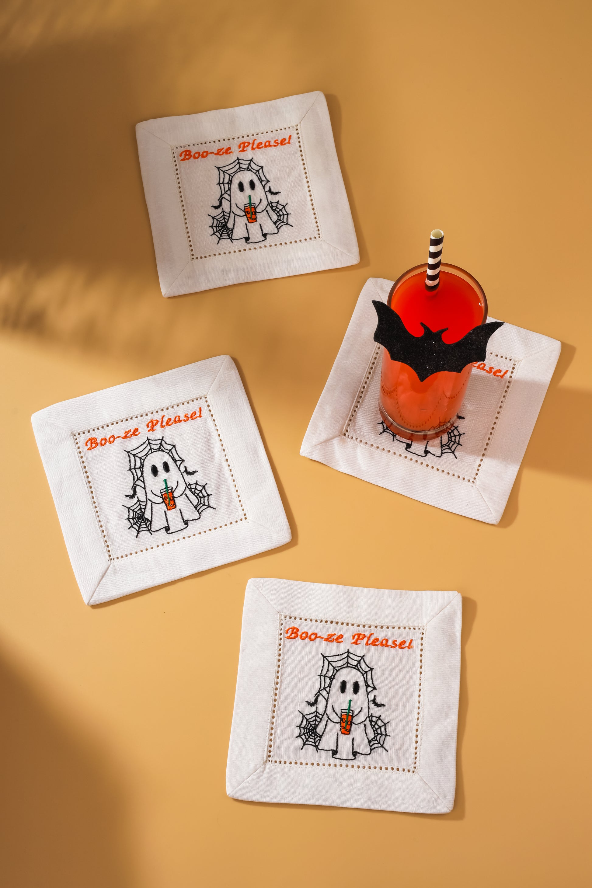Against a crisp white background, each napkin features a delightful, intricately embroidered ghost holding a drink with a straw, encircled by a spiderweb, and accompanied by the playful text "Boo-ze Please!" The detailed stitching and quality linen create a sophisticated yet spirited accent, perfect for adding unique character to any Halloween or themed event.