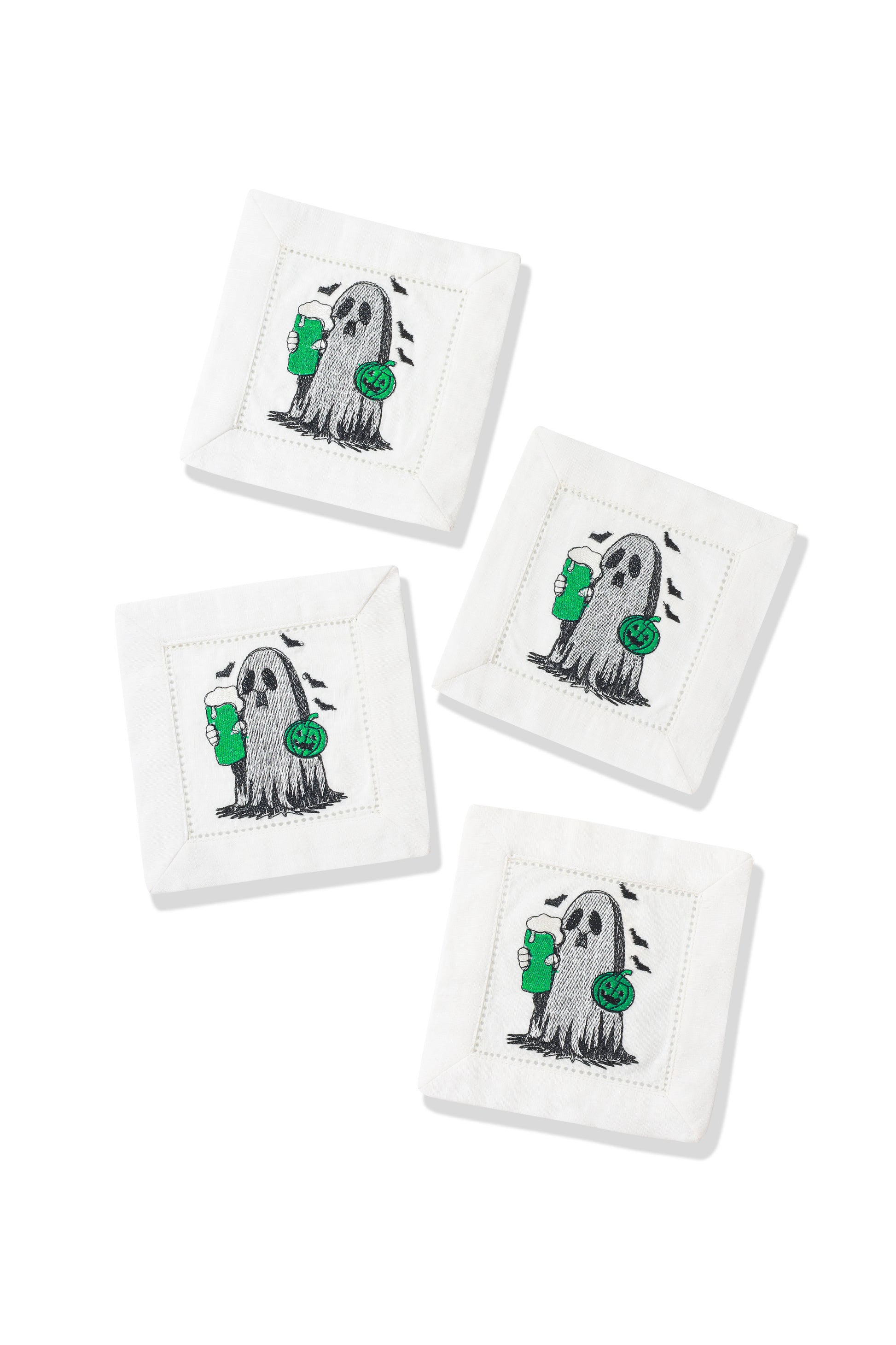 Key Features: Set of 4 Handcrafted Napkins: Designed for elevated, distinctive entertaining. 100% Premium Linen: Luxurious feel & excellent absorbency. 6" x 6" Size: Perfectly proportioned for cocktails. Intricate Embroidered Design: Whimsical ghost with green drink motif. Easy Care: Convenient machine wash and dry.