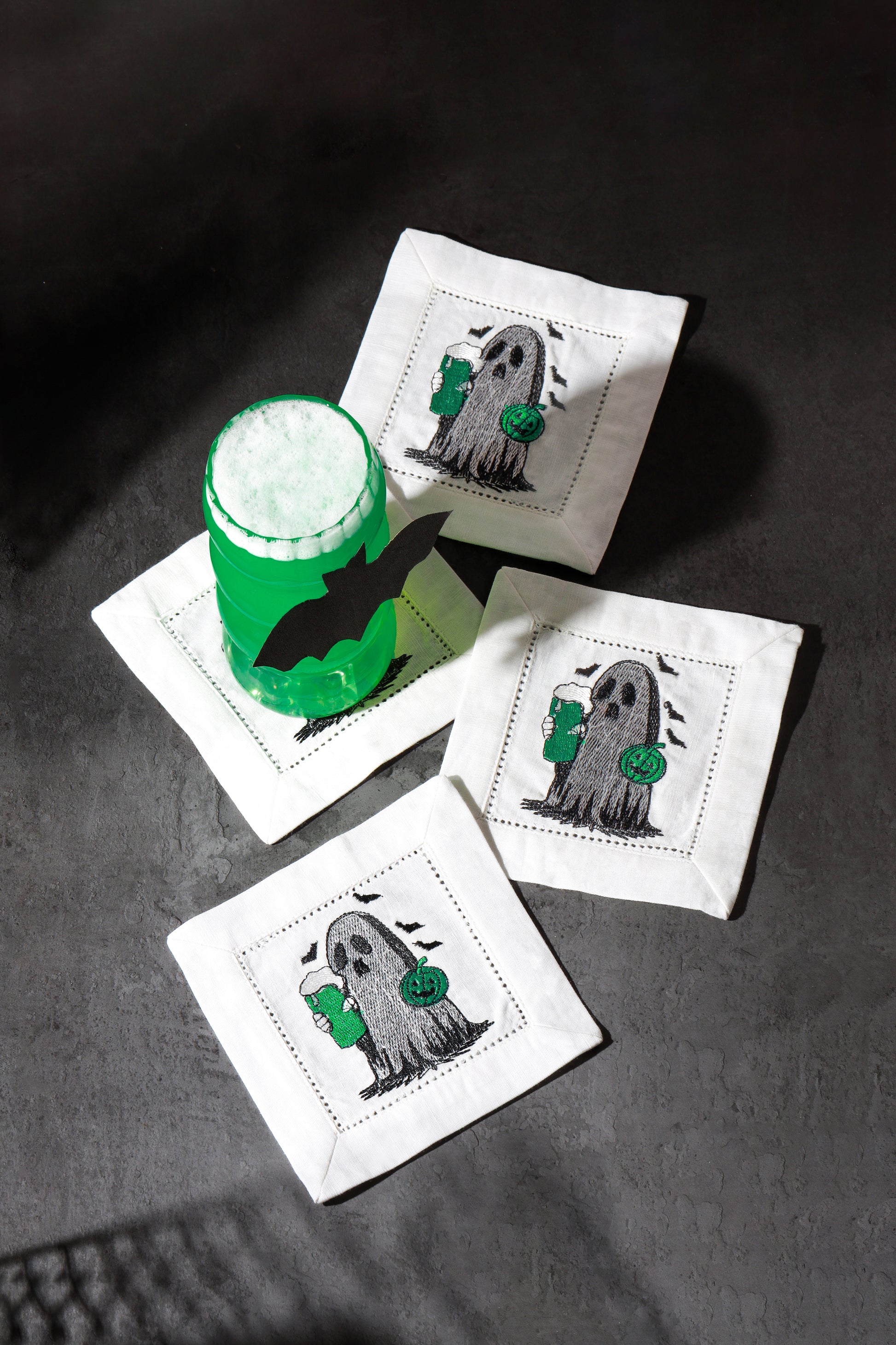 Against a crisp white background, each napkin features a charming, intricately embroidered ghost clutching a frothy green beverage, accompanied by tiny bats and a carved pumpkin. The detailed stitching and quality linen create a sophisticated yet whimsical accent, perfect for festive gatherings and adding unique character to your home bar.