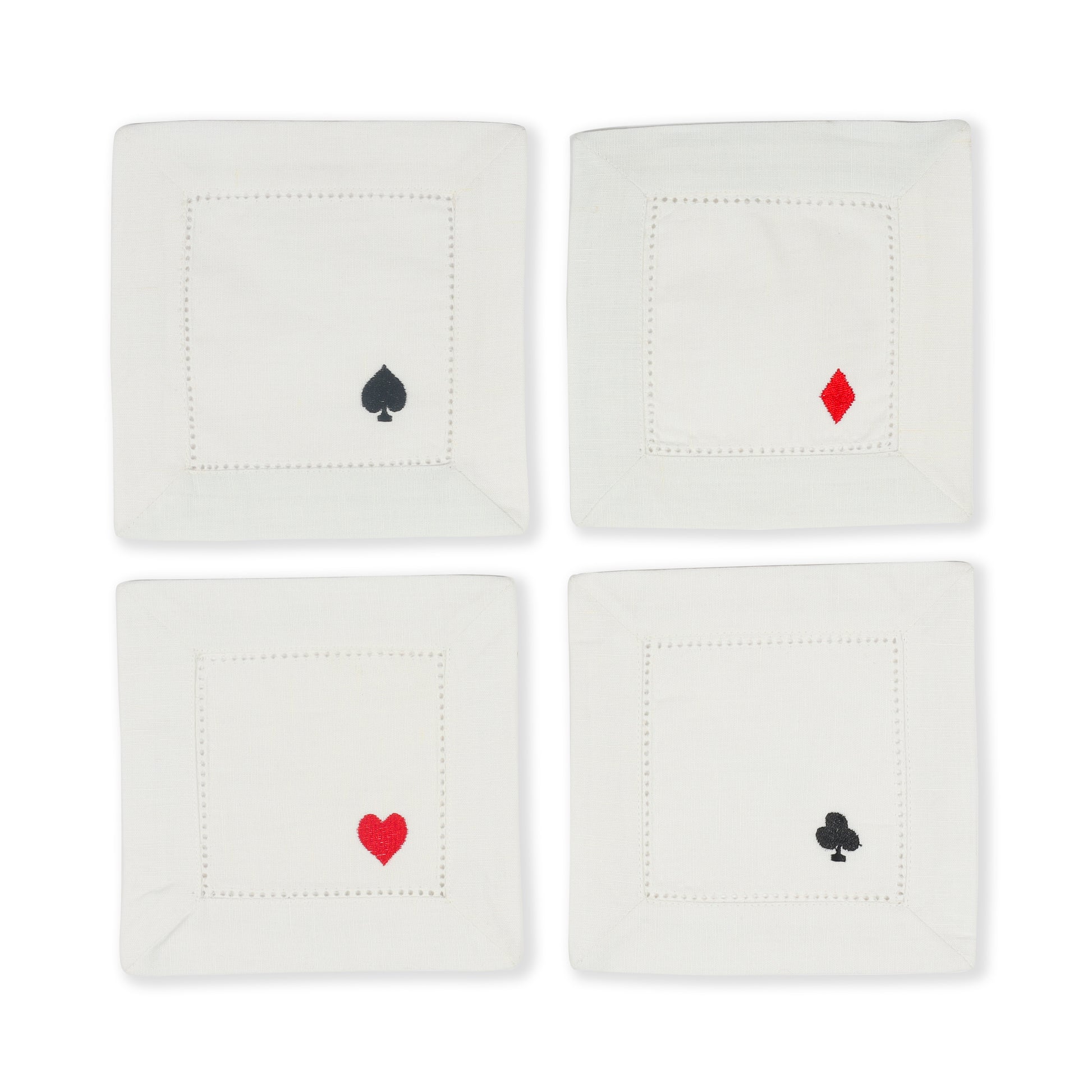 Introduce a playful element to your cocktail parties with our Playing Cards napkins. Each napkin features a hand-embroidered design of one of the four playing card suits – spade, diamond, heart, and club. Crafted from 100% linen, these napkins are perfect for adding a fun and whimsical touch to your events, making them a delightful addition for your guests.