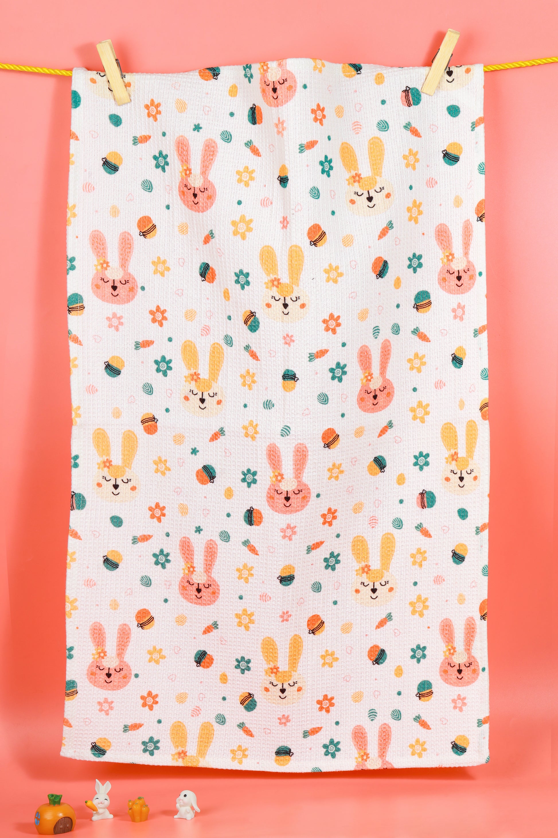 A sweet towel featuring a pattern of cute bunny faces, colorful eggs, and Easter baskets.