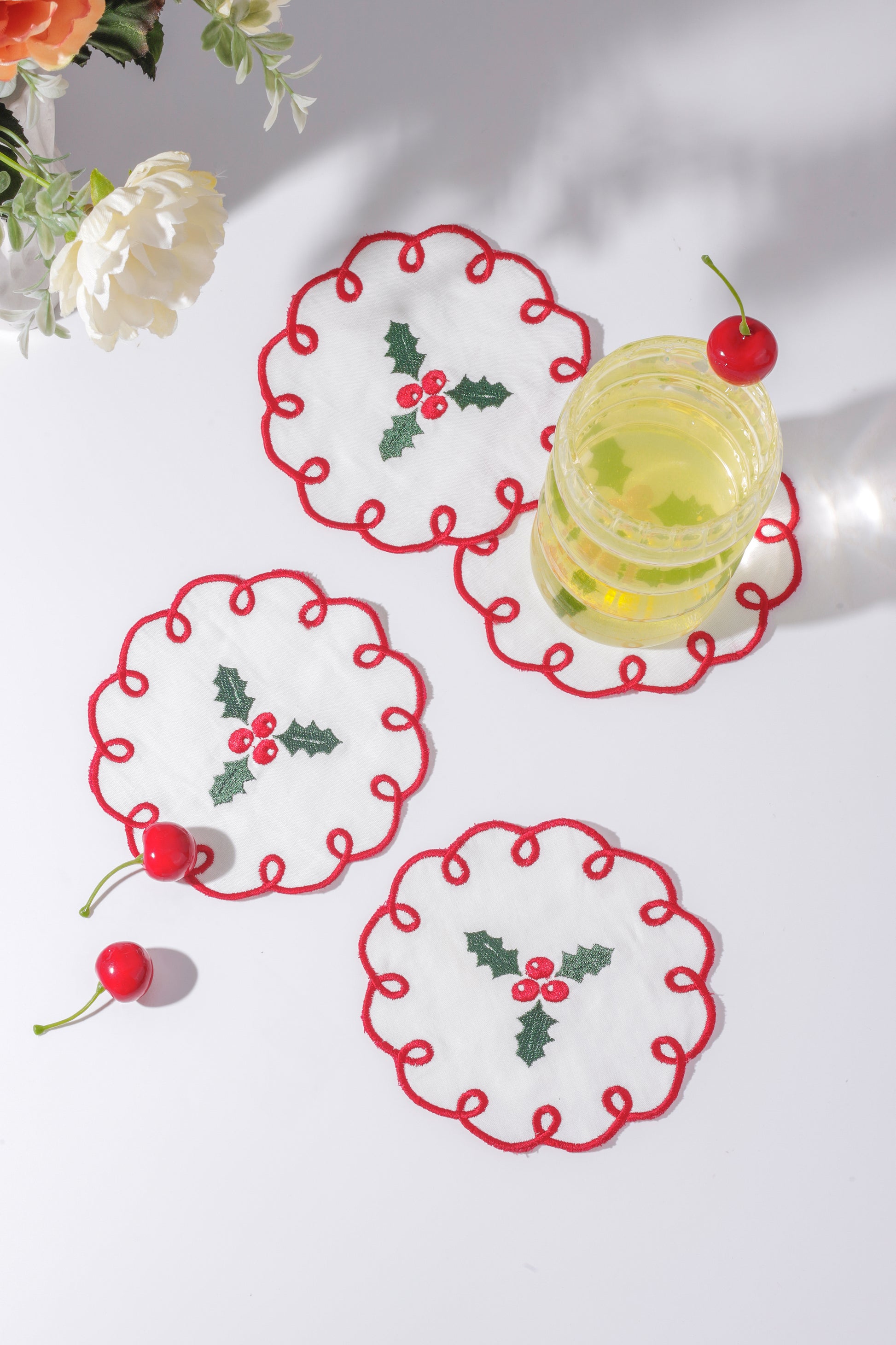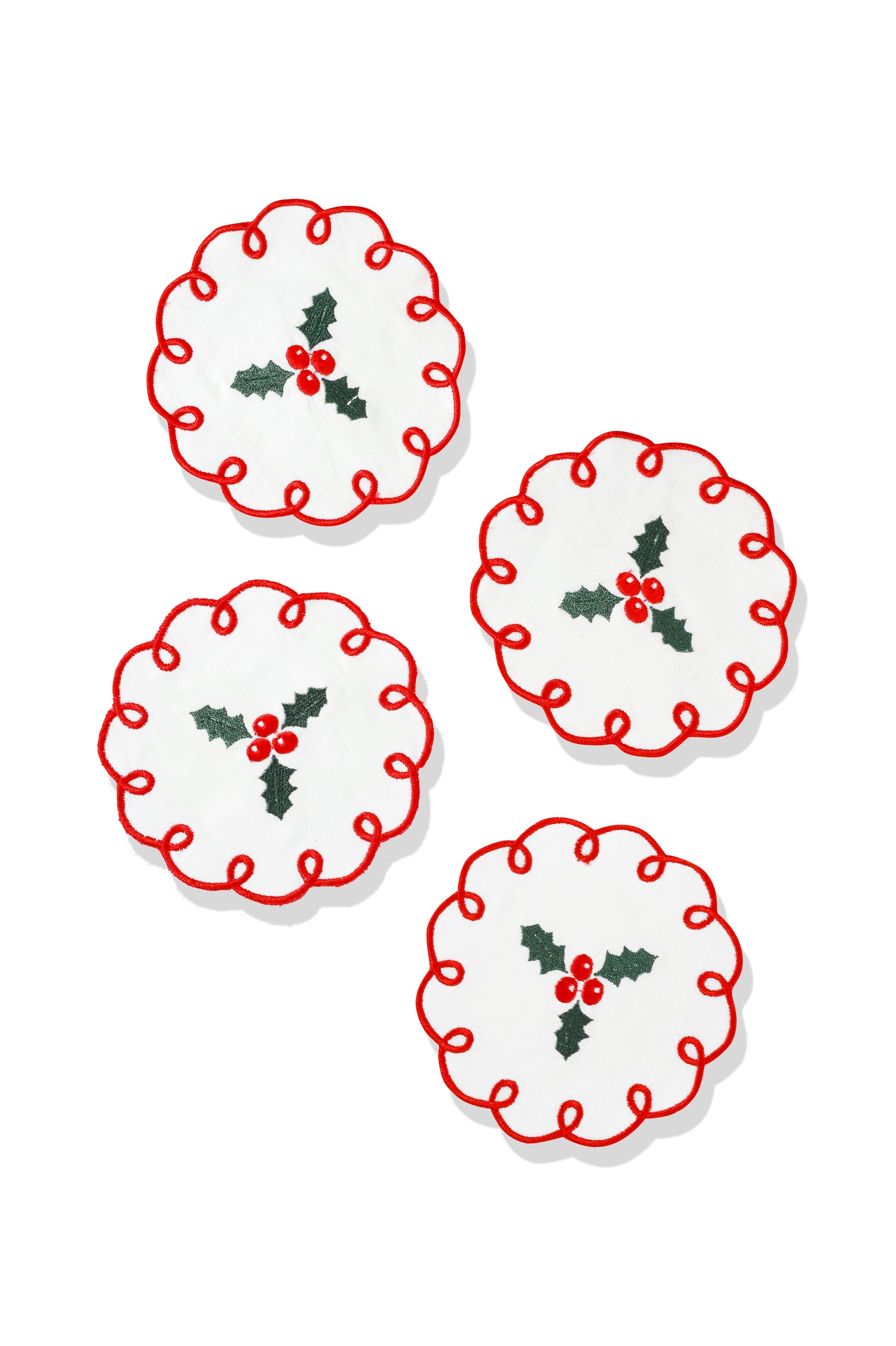 - Product Description: Bring timeless holiday elegance to your entertaining with these embroidered cocktail napkins, featuring festive holly leaves and bright red berries. The playful looped scallop border adds a cheerful finishing touch, making them a delightful accent for Christmas cocktails, holiday parties, or seasonal gifting.