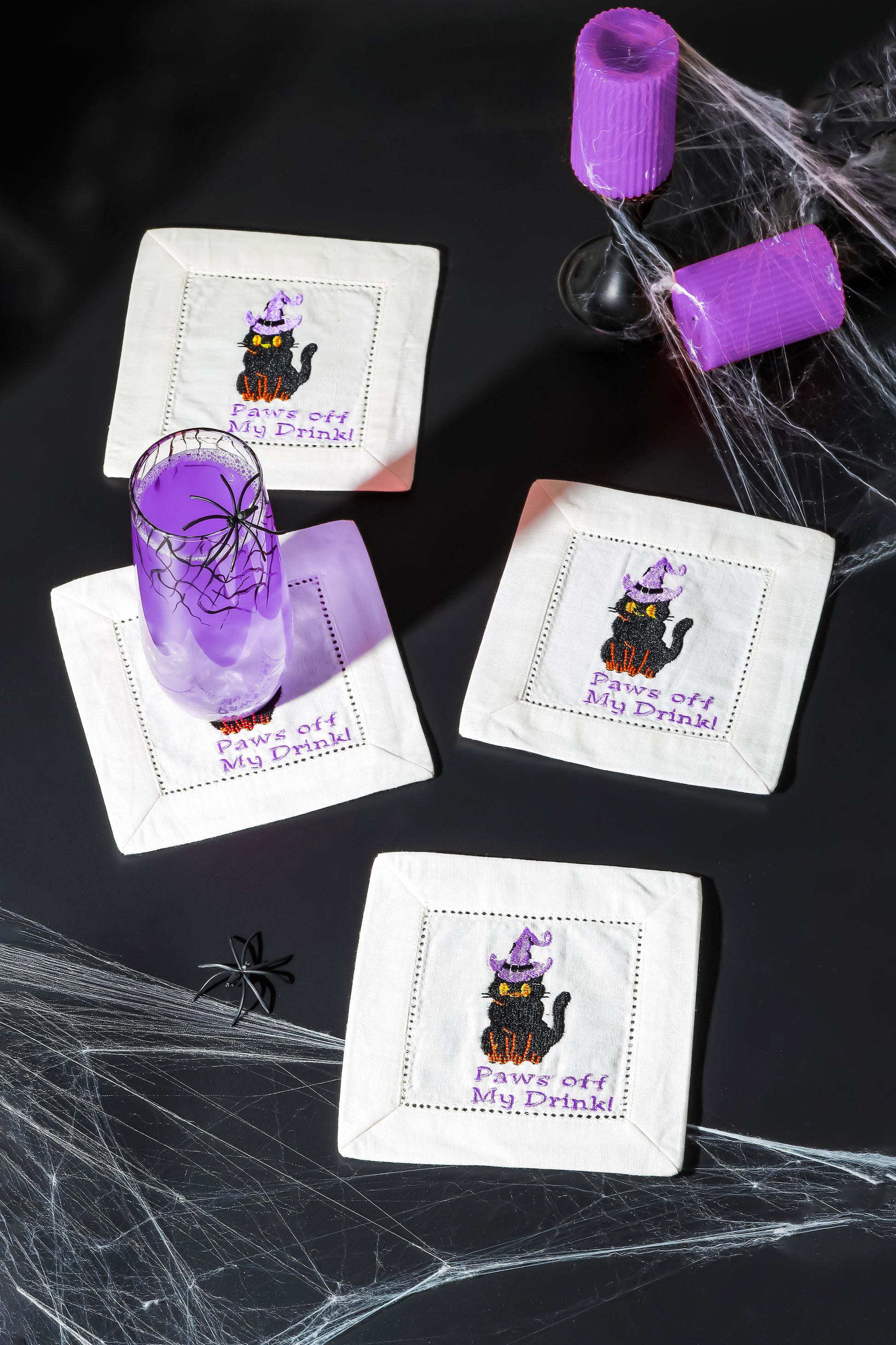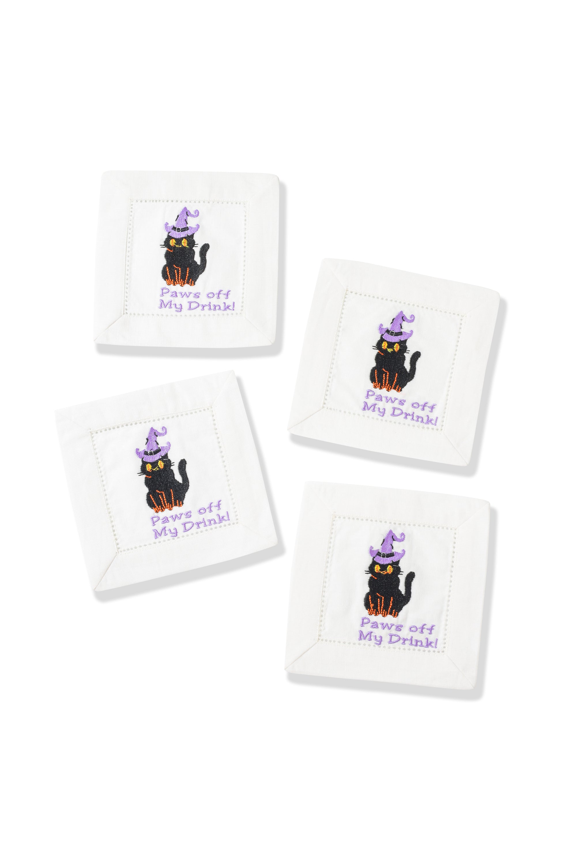 Against a crisp white background, each napkin features an adorable, intricately embroidered black cat wearing a whimsical purple witch's hat, accompanied by the playful text "Paws off My Drink!" The detailed stitching and quality linen create a sophisticated yet spirited accent, perfect for festive occasions or adding unique character to your home bar.