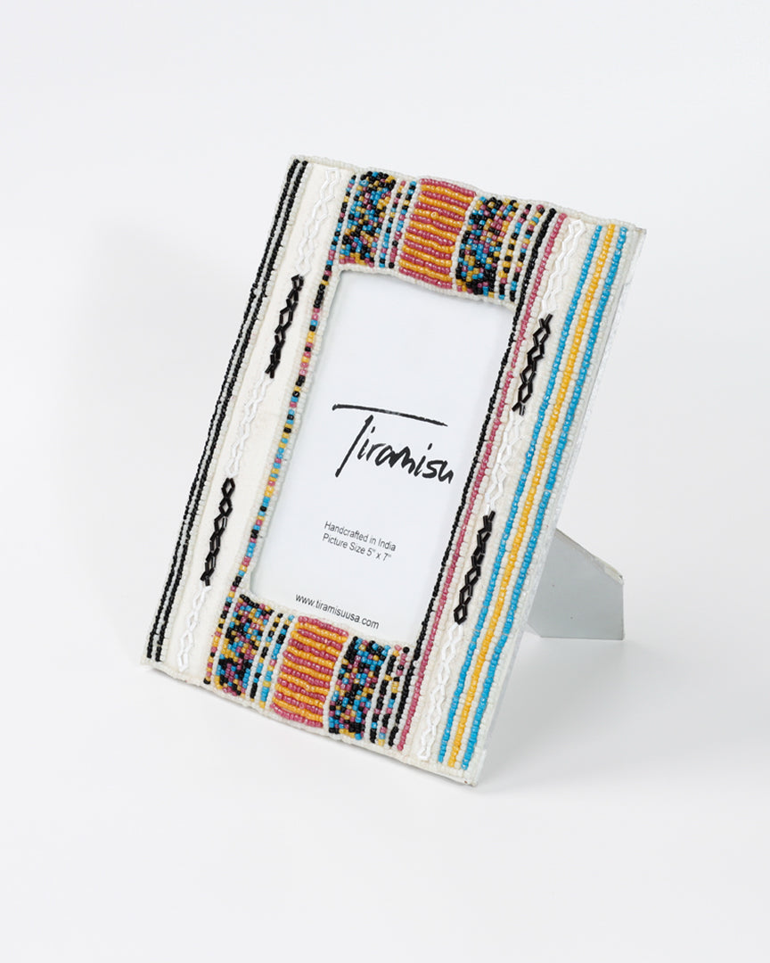 Infuse your home with unique style using the Tiramisu Monochrome Harmony Beaded picture frame. This striking hand-beaded frame combines bold black and white geometric patterns with vibrant bands of multi-colored beads, creating a captivating contrast. Made from fabric, beads, MDF, and glass, it offers a tactile and visually engaging border for your cherished 5x7 photos. It's an ideal choice for adding a contemporary yet artisanal touch to any display.